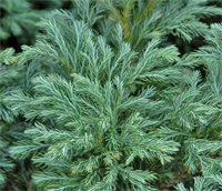 Falso Cipres, "Chamaecyparis Pisifera Boulevard". Una conífera de hoja perenne que toma una forma cónica con la copa abierta. El suave follaje verde azulado se dispone en ramilletes planos salpicados de unas pinas angulosas y verdes que, al madurar, se vuelven marrones.